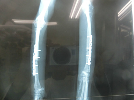 S.りんちゃんは、階段から飛び降りて、両前足を骨折しました。 二軒の病院で無理と言われ、当院を紹介されて、来られました。両前肢の橈骨尺骨が折れていました。 LCPプレートで手術しましたが、順調に回復し、今日は定期検査で元気に来院されました。 良かったね♥ おめでとう!