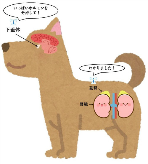 副腎皮質が分泌するホルモンの量をコントロールしている下垂体に腫瘍ができ、コントロールが効かなくなり、過剰に副腎皮質へとホルモン分泌の指令が出てしまいます、その結果糖質コルチコイドの分泌が過剰になってしまいクッシング症候群になってしまいます。