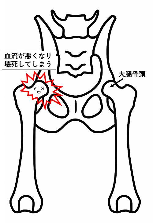 大腿骨頭および骨頸部に発症する疾患で、大腿骨頭への血液供給が制限または阻害されることにより、股関節の変形性関節症を招きます。成長板が閉鎖していない小型犬に多く見られ、通常は大腿骨の無菌的壊死が認められます。