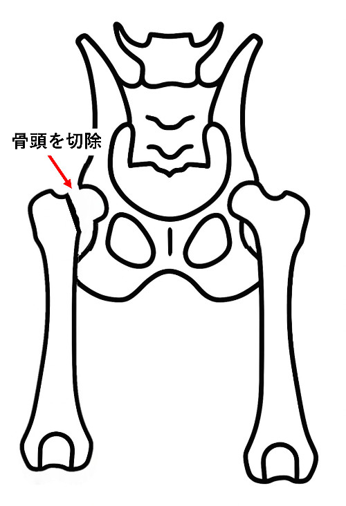 非ステロイド性消炎鎮痛剤と運動制限での保存療法をし、疼痛管理を行うこともありますが、症状が持続、進行する場合、大腿骨頭骨頸切除術を行います。骨頭を切除することにより、摩擦を軽減させます。切除した周囲の筋肉と軟組織が新たな関節のようなものを作ることで痛みがない動きができるようになります。